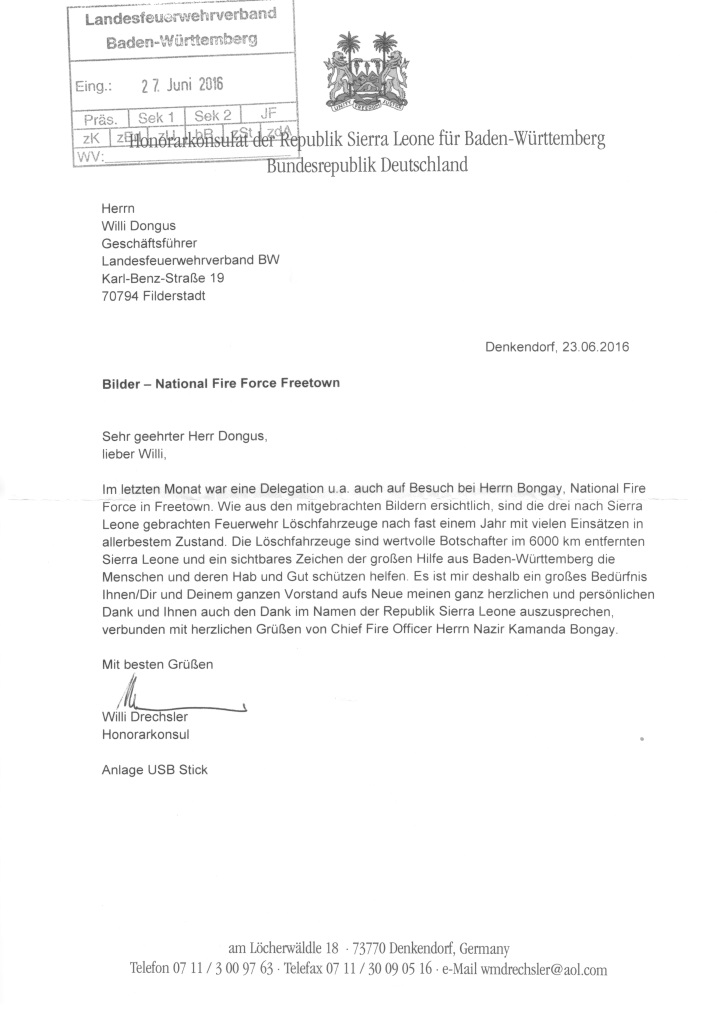 Nach nunmehr einem Jahr erreichten uns einige Bilder und ein Schreiben des Honorarkonsuls von Sierra Leone.