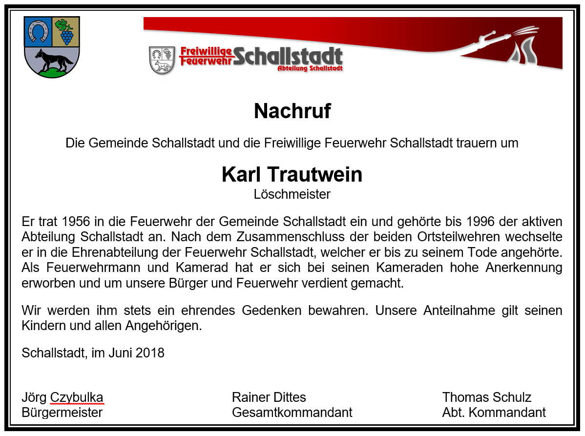 E-Mail Drucken Tod unseres Kameraden Karl Trautwein Geschrieben von Thomas Schulz. Veröffentlicht in News < Zurück Weiter >